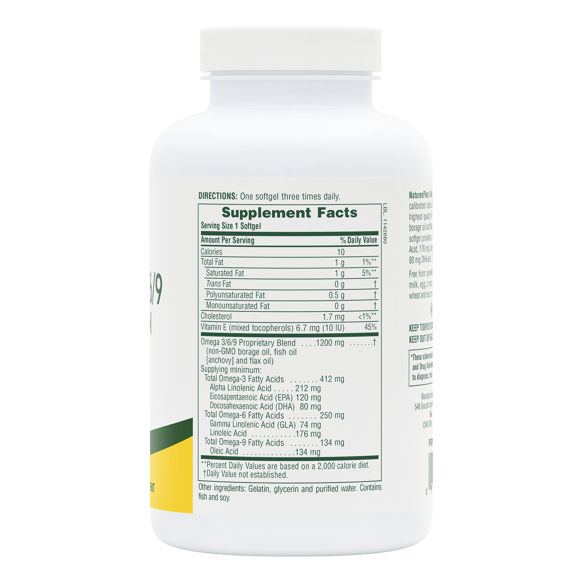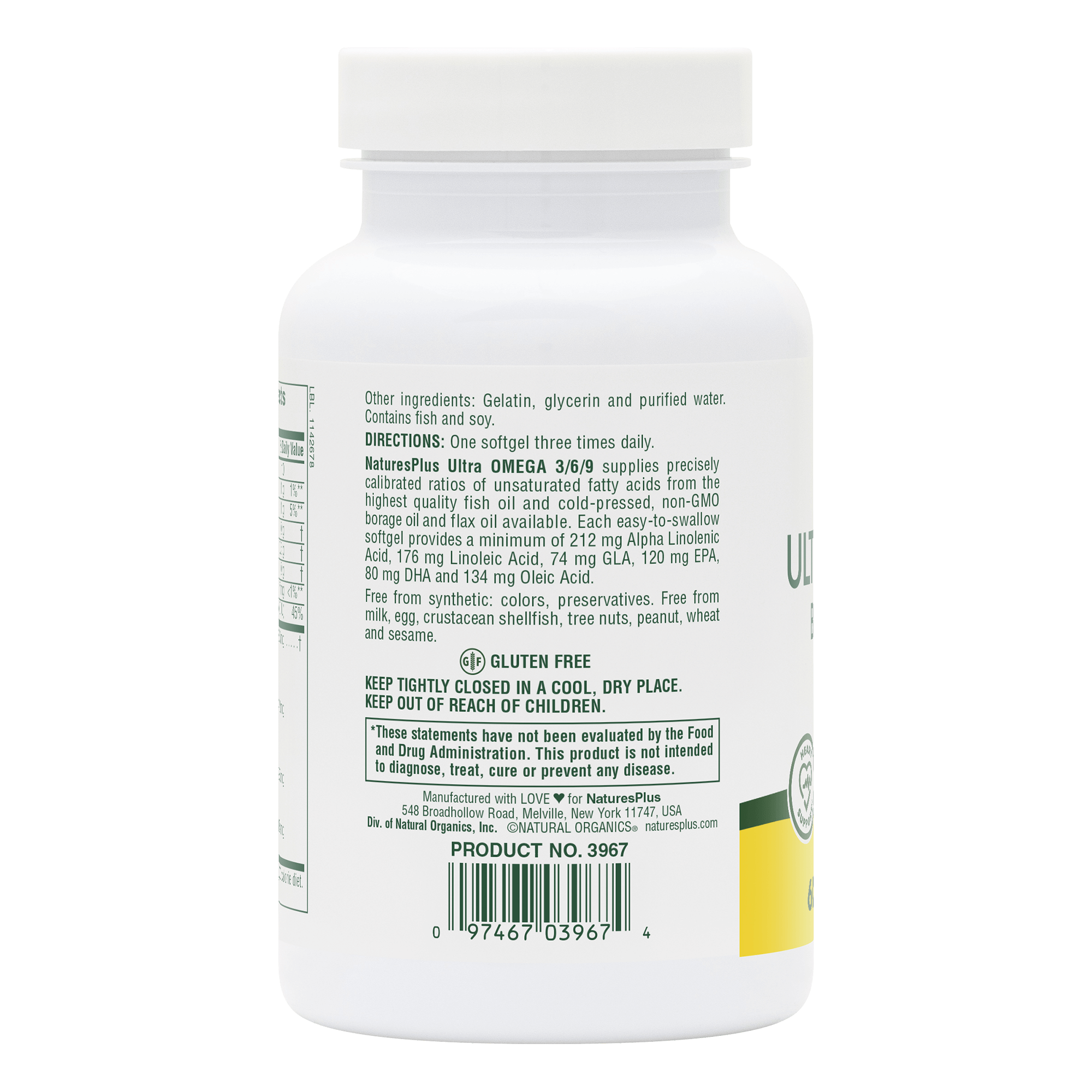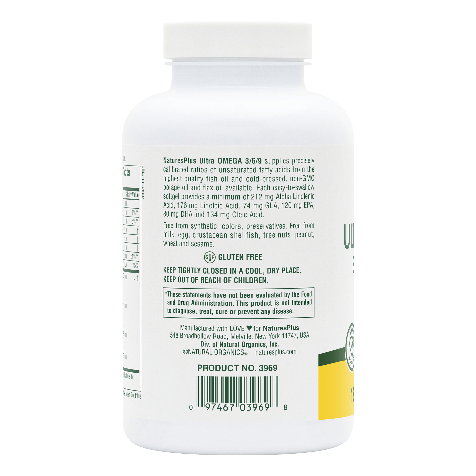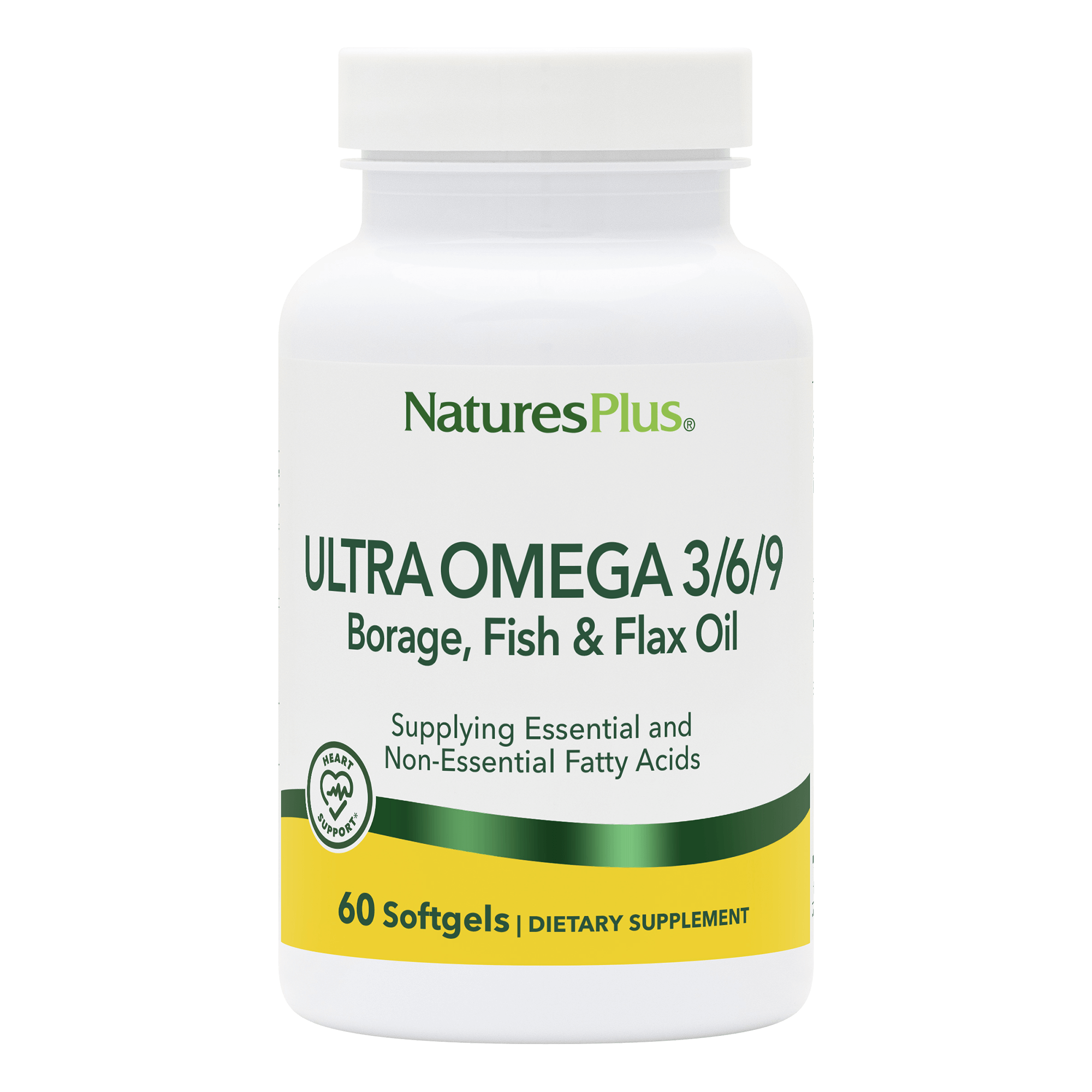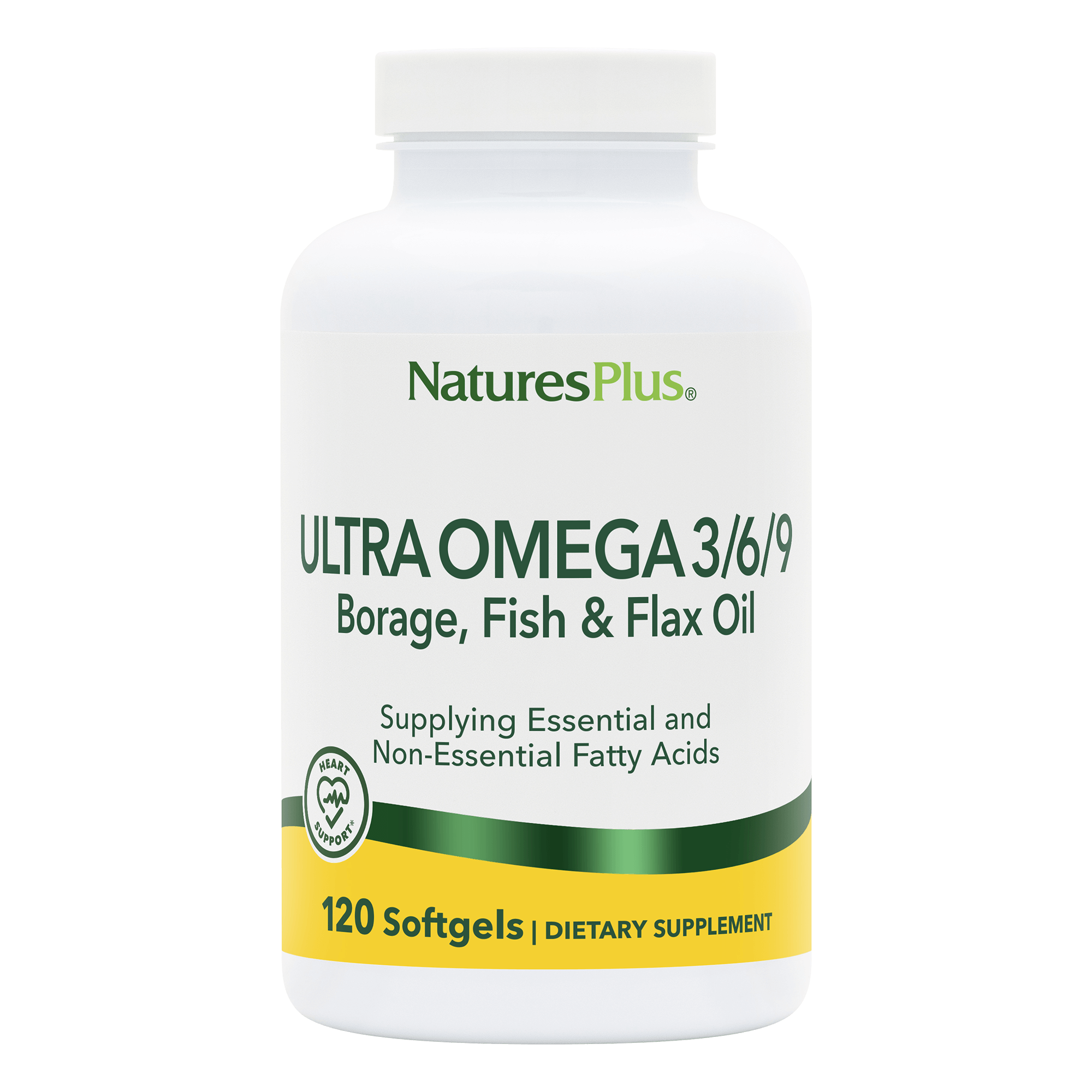 Ultra Omega 3/6/9 from NaturesPlus supplies precisely calibrated ratios of unsaturated fatty acids from the highest quality non-GMO borage oil, fish oil and flax oil available to help promote heart, bone, skin & brain health.*